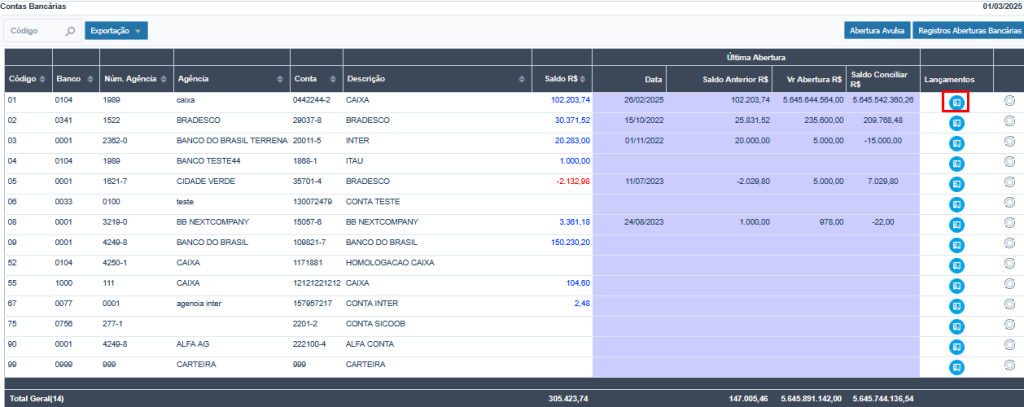 Para realizar a abertura bancária no wCompany, é necessário que primeiro, vá até a rotina 231. Gerenciar Movimentos Bancários, nessa rotina você terá a apresentação de todos as contas bancárias cadastradas, com alguma das suas informações.