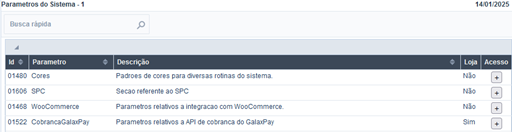 Dentro da tela parâmetros icomp.init encontra-se todos os padrões de parâmetros para o sistema. Pesquise por 512. parâmetros – icomp.init no campo de busca rápida para chegar a seguinte tela