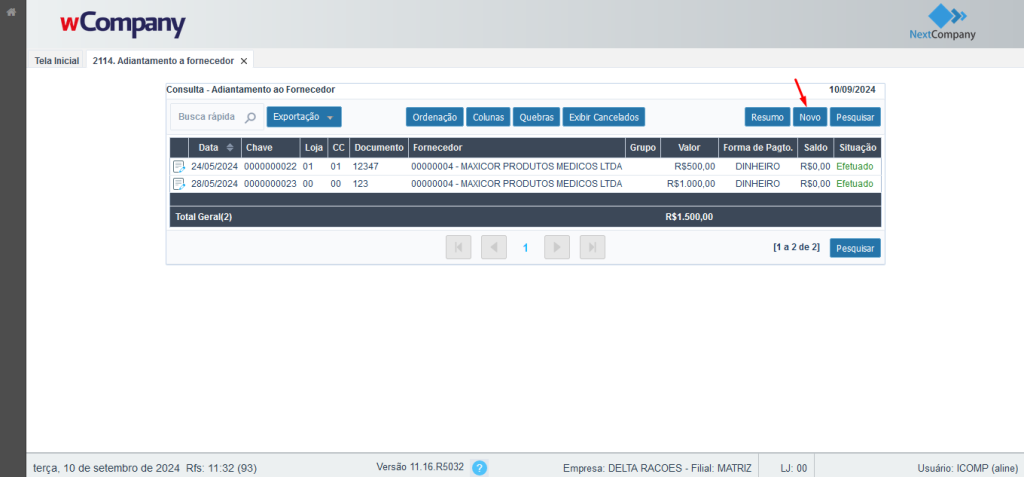 Para realizar adiantamento do pagamento a um fornecedor, siga o caminho: