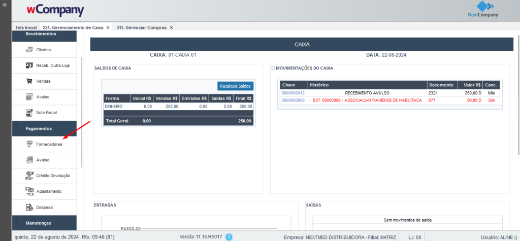 2. Backoffice → 22. Caixas → 221. Gerenciamento de Caixa.