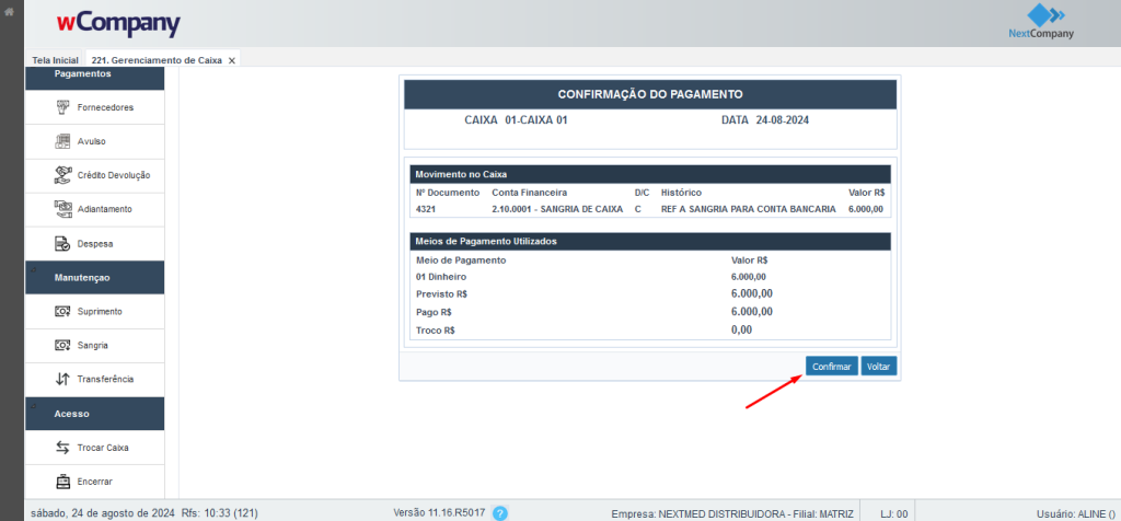 No exemplo a seguir, realizamos a sangria para uma conta bancaria da empresa.